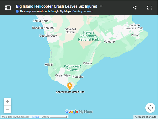 On June 8, 2022, a tour helicopter crashed in a lava field on the Big Island of Hawaii. Six people sustained injuries, including two victims who were hospitalized in serious condition.